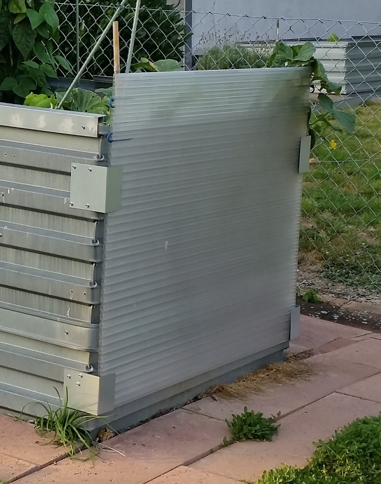Das Hochbeet besteht aus zwei U-förmig gebogenen Trapezblechelementen mit einer Standardbreite von ca. 125 cm und ca. 160 cm Schenkellänge. Nach dem Zusammenschieben der beiden Elemente kann das Hochbeet auf jede beliebige Länge zwischen ca. 165 cm und 300 cm eingestellt werden.