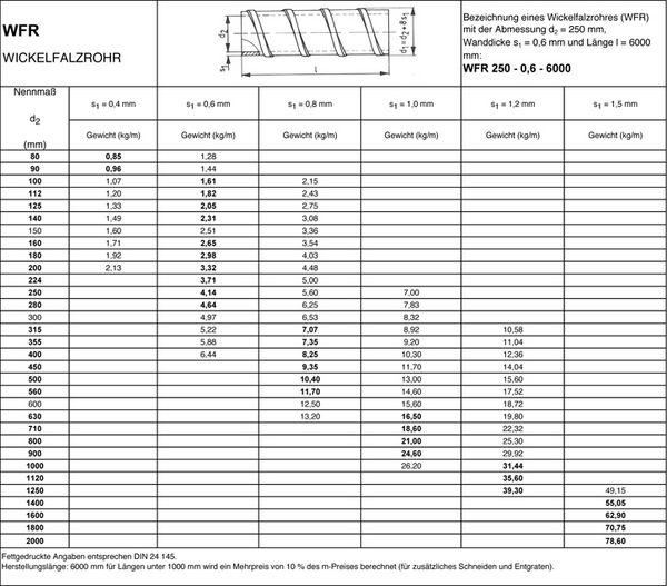 Die Wickelfalzrohre entsprechen DIN 24145 und werden ab einem Durchmesser von 8 cm bis 200 cm hergestellt.
