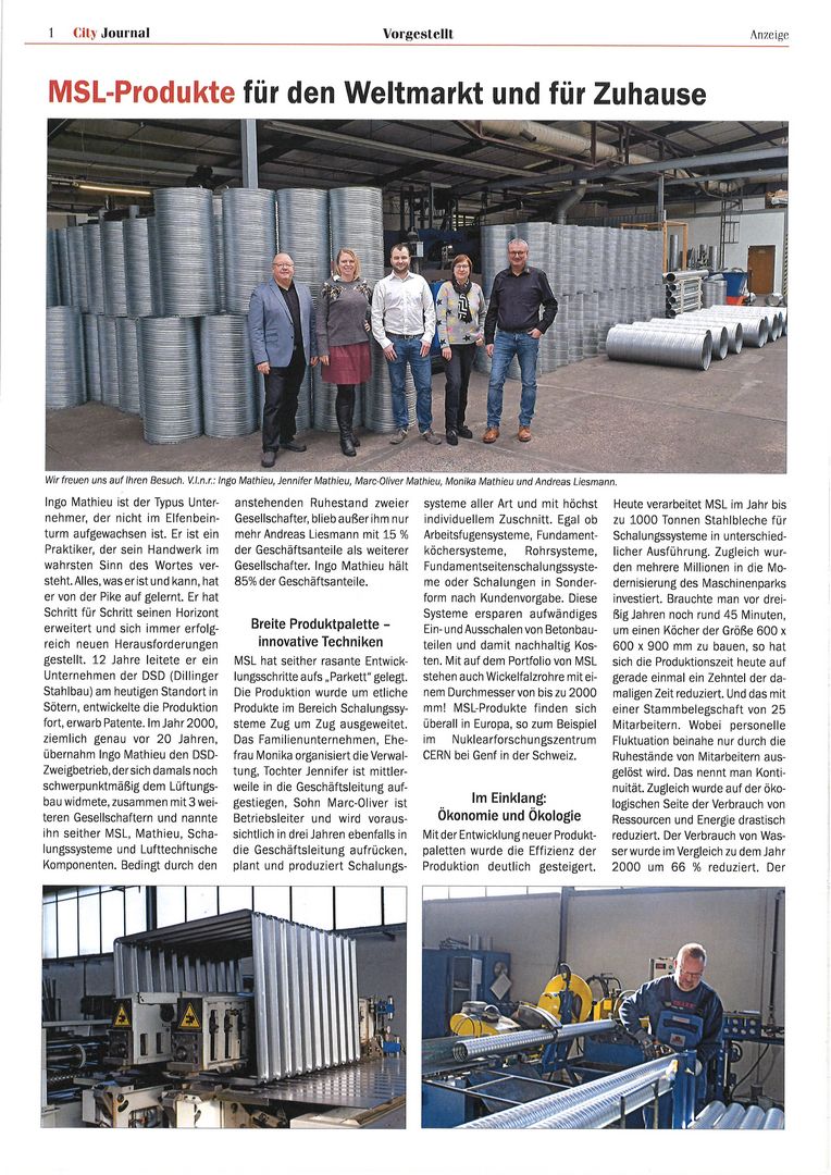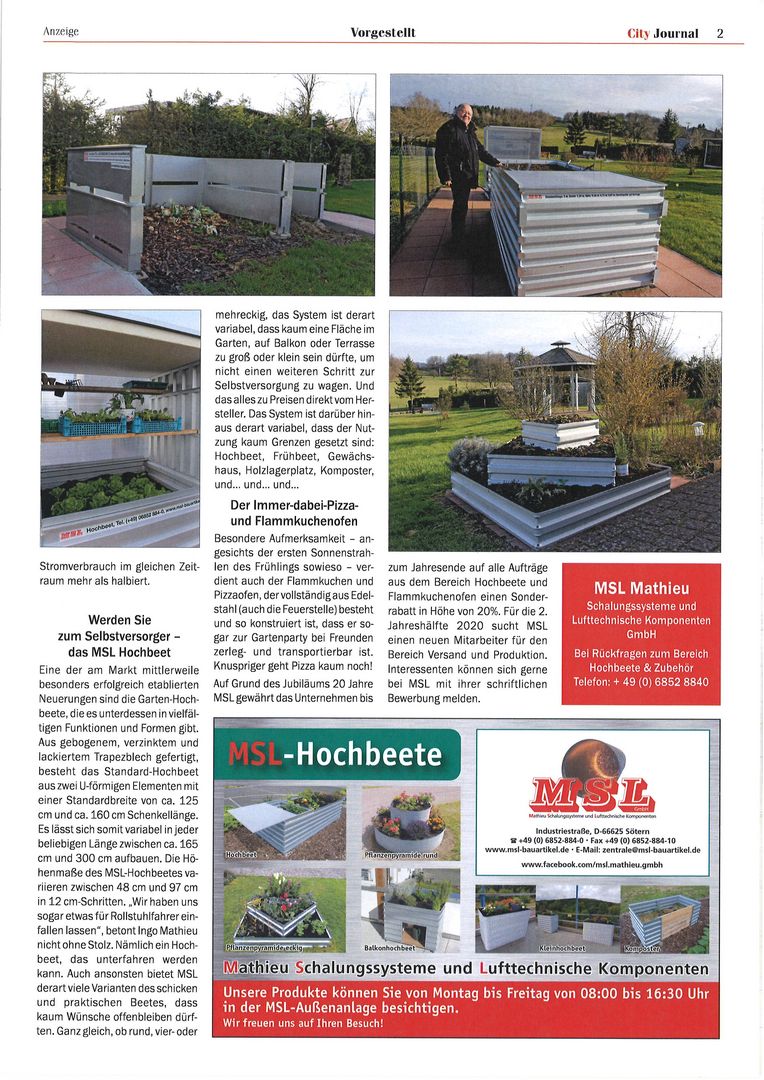 In der aktuellen Ausgabe des City Journals (April 2020) für den Landkreis St. Wendel ist ein Bericht über MSL, das 20jährige Firmenjubiläum und unsere Produkte aus dem Bereich Hochbeet, Garten und Freizeit.