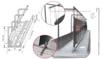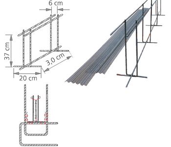 Das 3,0 m lange Fugenbandführungselement besteht aus 4 Fugenbandhaltern die durch 3 Längseisen fest miteinander verbunden sind. Die losen wellprofilierten Lochbleche werden an der aufgehenden Bewehrung befestigt. Das Fugenband wird bauseits in die Fugenbandhalter eingeführt und an den unteren und oberen Längseisen befestigt.