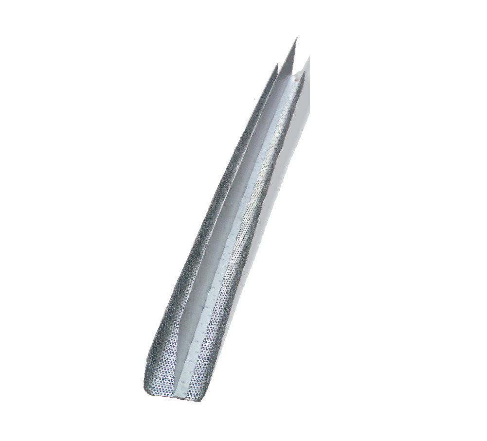 Standardelement, U-förmig gekantet aus wellprofiliertem Lochblech, Elementlänge 3,4 m, Elementbreite 15 cm, Aufkantungshöhe 9,5 cm, Fugenblech 250 mm/1,5 mm/3,5 m lang. Durch den im Radius gebogenen Eckbereich ergibt sich eine sehr hohe Stabilität, gleichzeitig erleichtert der gebogene Eckbereich das Rütteln unter dem Aufkantungselement.