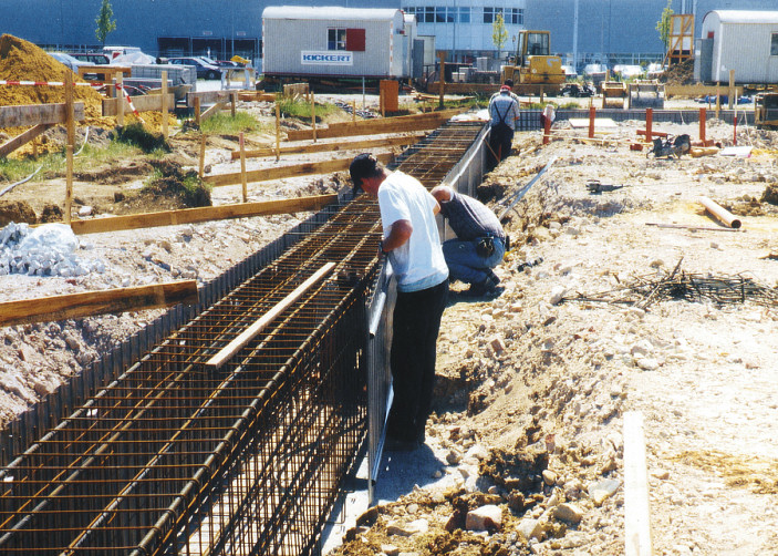 Ein wesentlicher Vorteil dieser Schalung ist, dass die Bewehrung bereits im Vorfeld nach dem Auslegen der unteren Steckbügel auf der Sauberkeitsschicht ungehindert aufgestellt werden kann. Weiterhin besteht die Möglichkeit, die Bewehrung nach dem Stellen der ersten Seitenwand aufzubauen (siehe Bild 4).