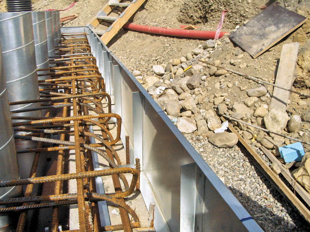 Eckelemente (Innenecke und Außenecke) werden durch Einschneiden der Aufstellfläche hergestellt. Beim Betonieren der Decke drückt das Betongewicht des Frischbetons auf das nach hinten zurückversetzte Schalungsdruckausgleichsblech und wirkt so als Gegenkraft zum Schalungsdruck. Wir empfehlen, die Elemente im Stoßbereich z. B. durch selbstschneidende Schrauben zu verbinden.